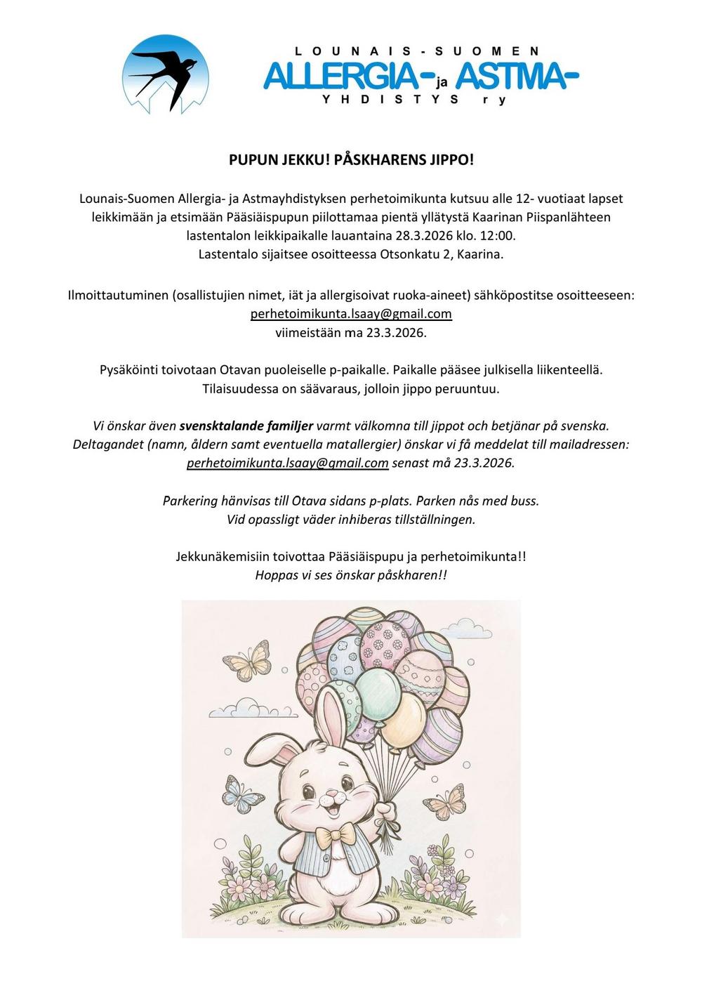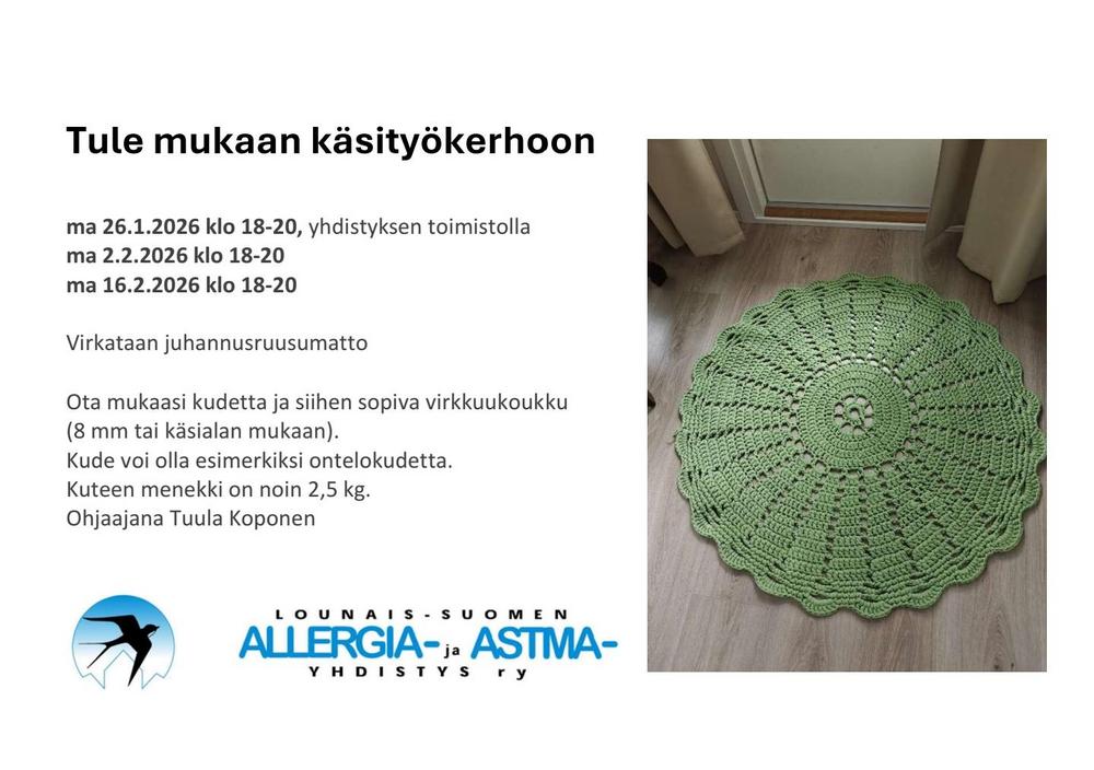 Yhdistyksemme perustehtävänä on allergiaa ja astmaa sairastavien elämänlaadun parantaminen. Meiltä saat tietoa ja vertaistukea liittyen allergiaan ja astmaan. Osallistu iltoihin, tapahtumiin ja ryhmiin. Hyppää vapaaehtoiseksi isolla tai pienellä panoksella. Tehdään yhdessä maailmasta helpompi ja mukavampi paikka elellä näiden sairauksien kanssa!