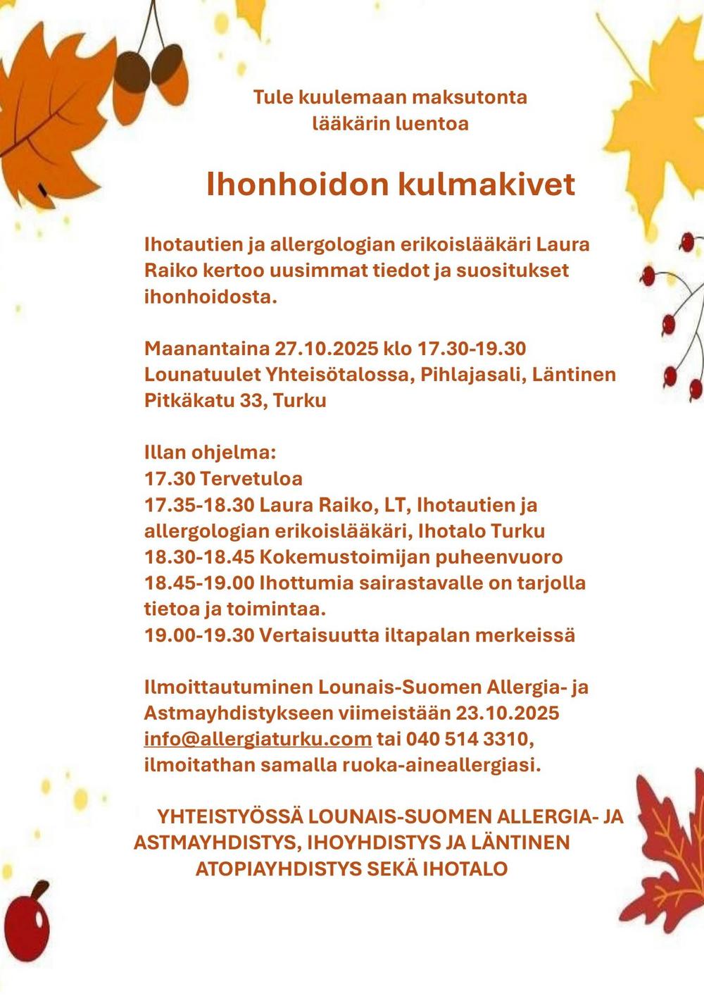 Tule kuulemaan asiantuntijan uusimmat tiedot ja suositukset ihon hoidosta. Ilmoittautumiset viimeistään 23.10.2025: info@allergiaturku.com tai 040 541 3310.